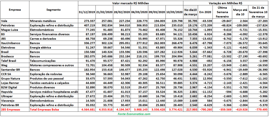 De acordo com os números da consultoria, destas 20 companhias, apenas quatro estão em alta no ano: a B3 (B3SA3) acumula ganhos de R$ 6,92 bilhões de valor de mercado, a Weg (WEGE3) ganhou R$ 15,21 bilhões, a Natura (NTCO3) com R$ 12,96 bilhões e Via Varejo com R$ 584 milhões.