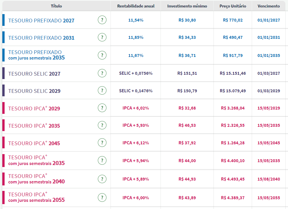 Confira os preços e as taxas dos títulos públicos disponíveis para compra no Tesouro Direto nesta terça-feira (06), na atualização de 09h40: