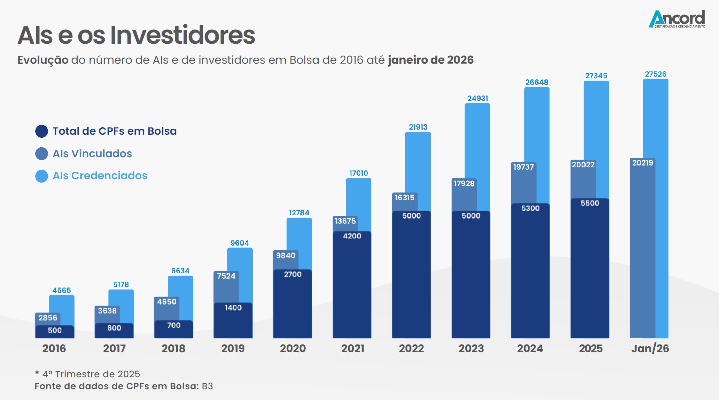 O número de assessores de investimentos credenciados no Brasil avançou entre o fim de 2025 e janeiro de 2026, segundo dados da ANCORD (Associação Nacional das Corretoras e Distribuidoras de Títulos e Valores Mobiliários, Câmbio e Mercadorias). O total passou de 27.345 profissionais em 2025 para 27.526 no primeiro mês de 2026.