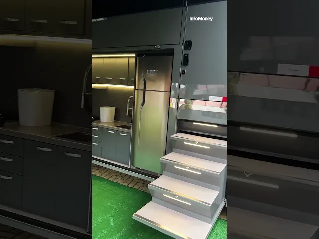 Ao parar, um sistema slide-out expande a carroceria, criando cerca de 45 m² — tamanho de um apê pequeno em capitais como São Paulo. A sala de estar vira hub social: sofá retrátil, lareira, micro-ondas, geladeira, adega e espaço para taças, com iluminação indireta e acabamentos premium.
