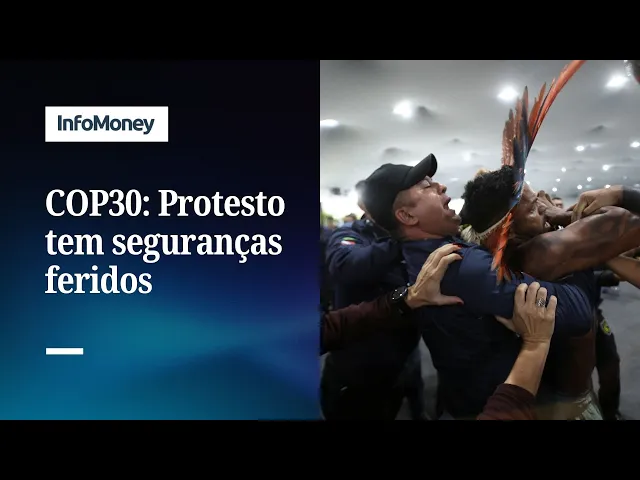 Manifestantes brandindo cassetetes tentavam forçar a entrada no local que abriga a COP30 nesta terça-feira, onde entraram em confronto com os seguranças.