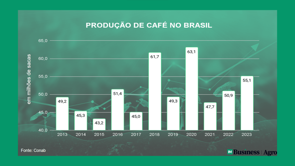 O Brasil deve colher pouco mais de 55 milhões de sacas de café em 2023. A nova estimativa da Conab é 8% maior que a produção realizada em 2022 e 1,3% superior ao número apontado no terceiro levantamento, apresentado em setembro.