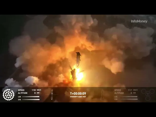 A espaçonave de dois estágios, que consiste na nave Starship montada sobre seu imponente foguete de propulsão Super Heavy, decolou do local de lançamento Starbase da empresa, próximo a Boca Chica Village, no sul do Texas, enviando poderosas ondas de choque que se propagaram pela densa neblina da Costa do Golfo.