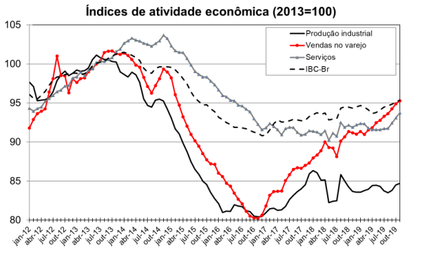 O humor dos analistas econômicos, grupo ao qual pertenço, andou flutuando nas últimas semanas. Depois de um conjunto de números positivos referentes a outubro de 2019, quando a produção industrial, as vendas no varejo e a oferta de serviços cresceram 0,8%, 0,9% e 0,8% respectivamente, os dados relativos a novembro vieram todos na direção oposta: -1,2%, 0,6% e -0,1%. Foi o que bastou para que o moderado otimismo do mês passado se dissipasse.