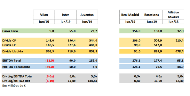 O conceito de dívida real é aquele que considera pagamentos a bancos, entidades financeiras, mercado de capitais, fornecedores, remuneração (em vários clubes os pagamentos são concentrados em períodos do ano, por isso carregam valores tão elevados de caixa, que vai sendo formado ao longo da temporada), outros clubes. Certamente os clubes europeus possuem muitas dívidas. A questão mais importante é que elas estão lastreadas em acionistas comprometidos ou em geração de caixa compatível.