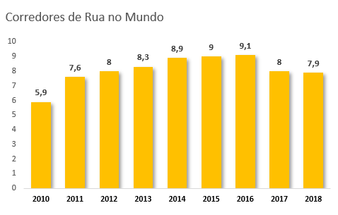 Segundo o estudo mundial The State of Running (projeto da RunRepeat com a IAAF, que é a Federação Internacional de Atletismo), que compilou dados de 1986 a 2018, do equivalente a 91% de toda as provas disputadas no Mundo no período, o número estimado de corredores regulares no mundo é de 7,9 milhões de pessoas, e apresenta queda em relação ao pico de 2016 (9,1 milhões).