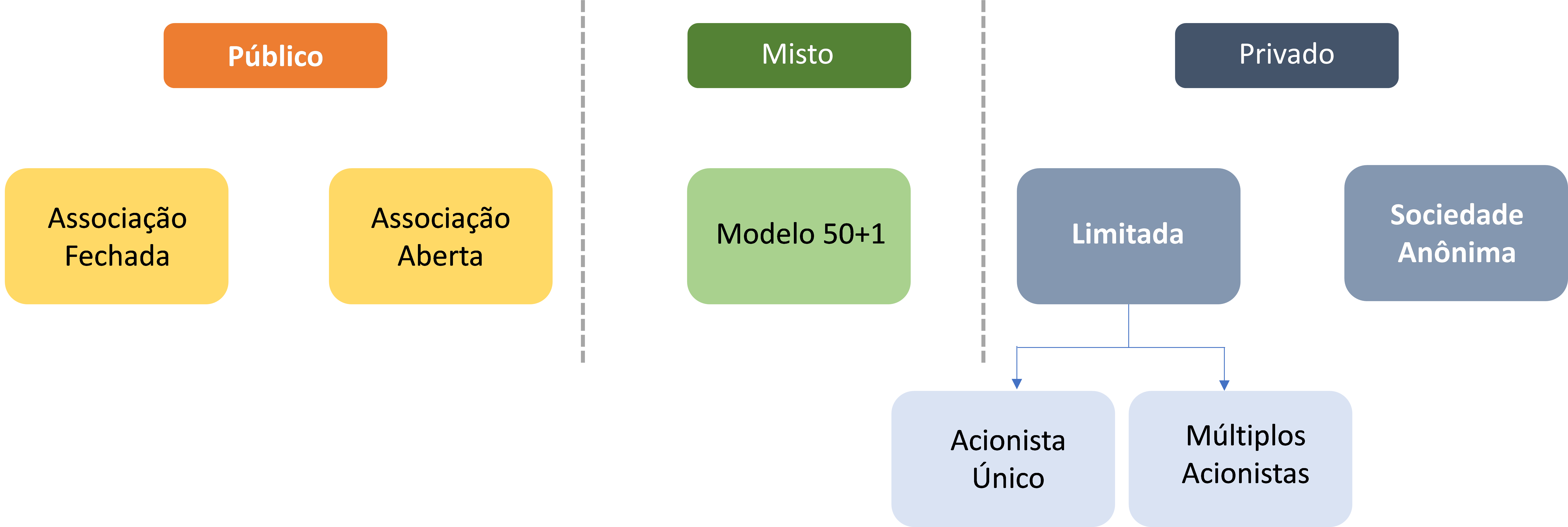 Vamos então entrar nas análises dos modelos, apontando riscos e benefícios. Para isso listo alguns dos modelos societários que são aplicados no mundo e podem ser aplicados no Brasil.