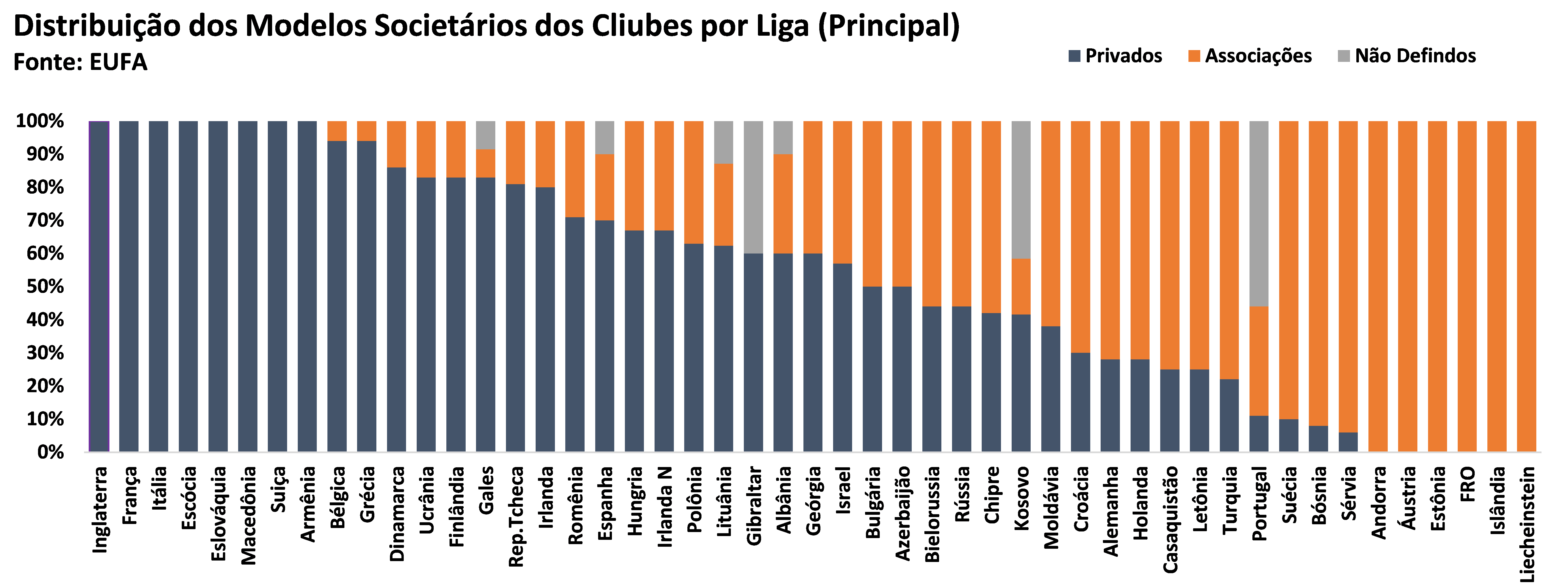 No gráfico abaixo temos a abertura dos modelos societárias nas primeiras divisões das ligas europeias. Na Inglaterra, França, Itália, Escócia, Macedônia, Eslováquia, Suiça e Armênia todos os clubes são privados. A partir daí começa a haver uma mistura, sendo que em 12 existem apenas clubes públicos (associações), ou com controle dessas (na Alemanha os clubes são considerados públicos, exceto Wolfsburg e Bayer Leverkusen). Segundo o relatório UEFA Benchmark referente a 17/18, 50% dos clubes das primeiras divisões europeias eram privados e outros 50% públicos (Associações).