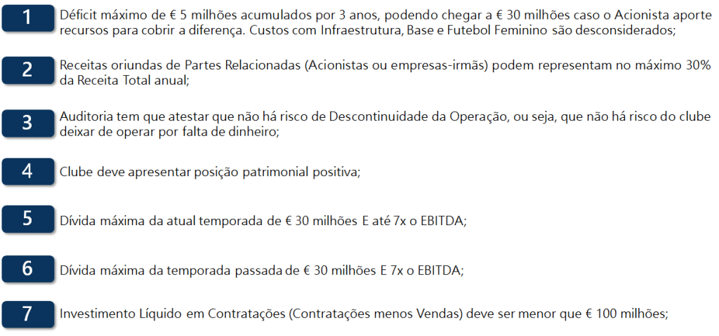 Voltando ao Fair Play Financeiro, a UEFA tem 7 regras assim definidas e avaliadas anualmente, quando da publicação das demonstrações financeiras pelos clubes: