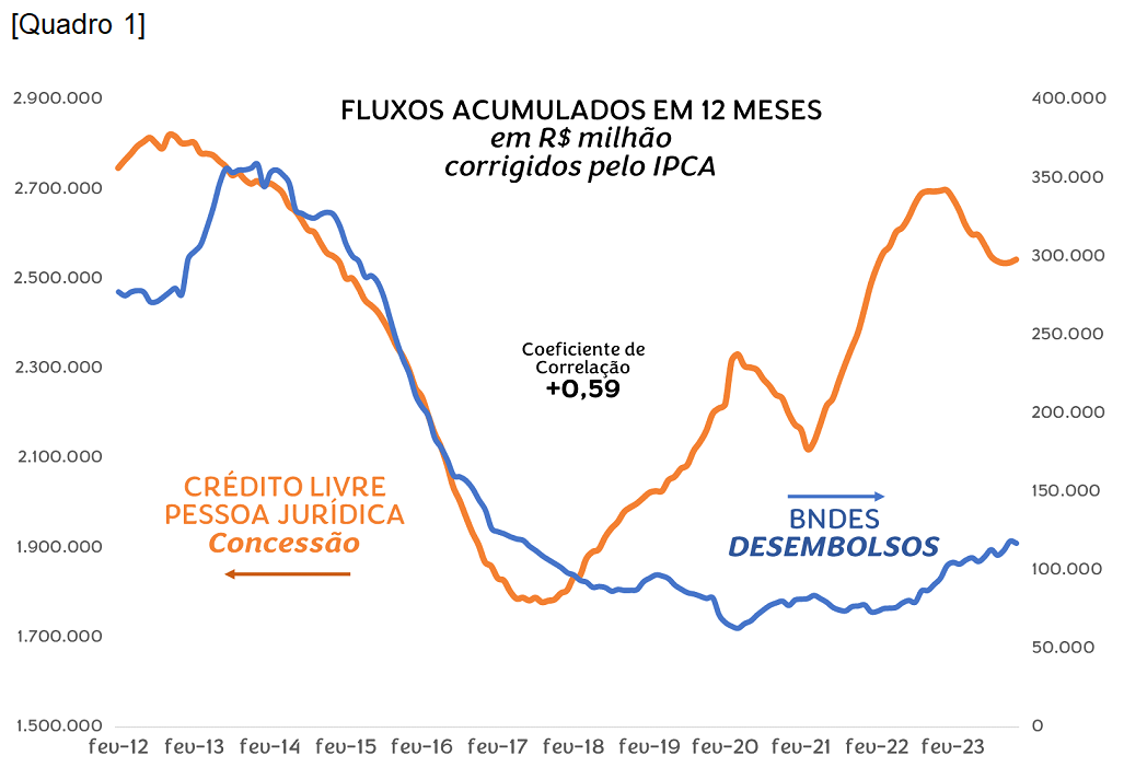 Ao estudar o Quadro 1 é perceptível que, ao contrário de sequestrar parte do mercado de recursos de longo prazo aos bancos e fundos privados, o BNDES tem agido in tandem com a banca comercial. A correlação estatística entre as concessões de um e de outros tem sido de sinal positivo, ou seja, o BNDES não tem tido praticamente nenhuma atuação contracíclica, uma vez se expande ou encolhe suas atividades na mesma toada dos parceiros comerciais, públicos e privados.