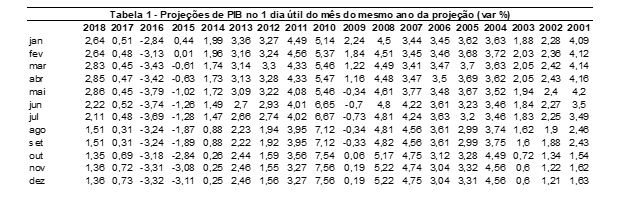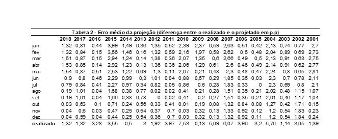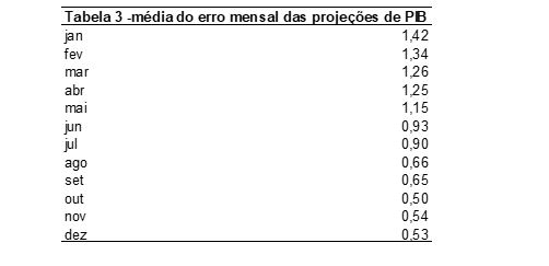 De acordo com as tabelas 1 e 2, o menor erro médio para o mês de fevereiro ocorreu em 2016. Naquele ano, a projeção em fevereiro de 2016 era de -3,13% e o PIB efetivo foi de -3,28%. Já o maior erro ocorre em janeiro de 2015 (3,99 p.p). Para aquele ano a projeção em janeiro era de 0,44% (ver tabela 1), e a variação real foi de 3,55%.