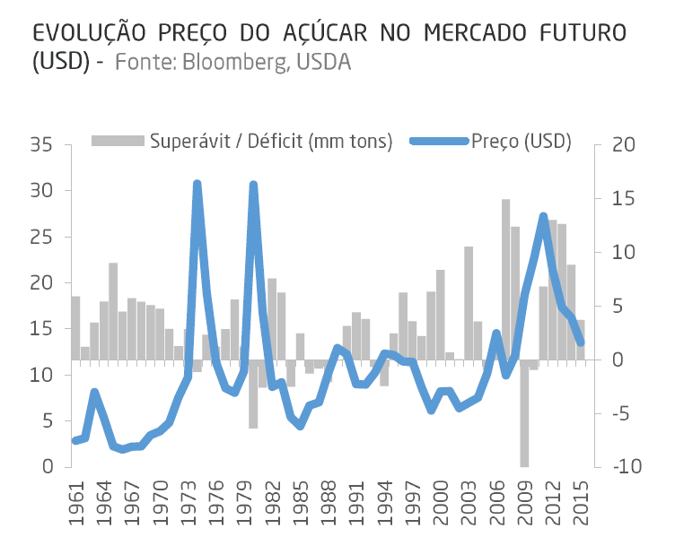Os últimos sete anos foram marcados por preços de açúcar extremamente deprimidos, o que levou o setor a uma crise, derrubando investimentos em crescimento de oferta. Já a demanda cresce anualmente de forma linear. Essa diferença fará com que a safra atual seja a primeira na qual a oferta não será suficiente para atender a demanda, ou seja, a primeira deficitária depois de cinco safras superavitárias, suportando o preço da commodity. E mesmo assim não estamos vendo o investimento no setor crescer de forma substancial, o que nos faz acreditar que teremos mais uma ou duas safras deficitárias pela frente. Ou seja, o preço do açúcar provavelmente ficará pressionado por um prazo maior.