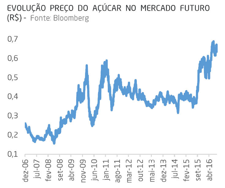 Os últimos sete anos foram marcados por preços de açúcar extremamente deprimidos, o que levou o setor a uma crise, derrubando investimentos em crescimento de oferta. Já a demanda cresce anualmente de forma linear. Essa diferença fará com que a safra atual seja a primeira na qual a oferta não será suficiente para atender a demanda, ou seja, a primeira deficitária depois de cinco safras superavitárias, suportando o preço da commodity. E mesmo assim não estamos vendo o investimento no setor crescer de forma substancial, o que nos faz acreditar que teremos mais uma ou duas safras deficitárias pela frente. Ou seja, o preço do açúcar provavelmente ficará pressionado por um prazo maior.