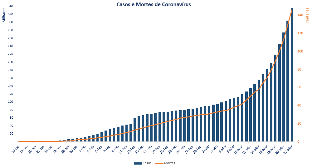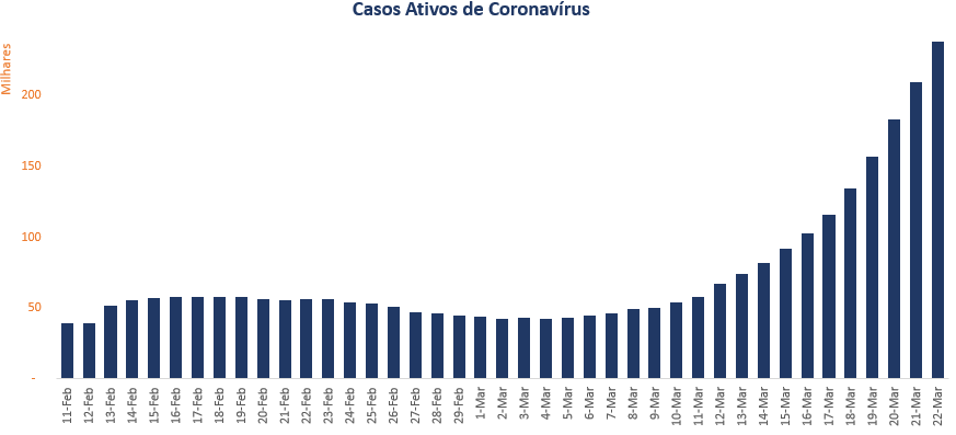 Hoje a China representa apenas 24% dos casos totais do mundo, comparado com 99% há um mês. Em uma semana, o número de casos foi de 169.000, no domingo dia 15, para 336.000, no domingo dia 22.