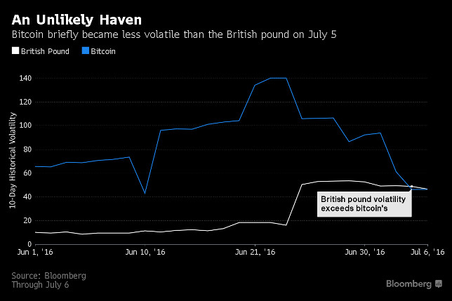As turbulências no mercado financeiro pós Brexit fizeram a libra esterlina apresentar uma volatilidade maior que a do bitcoin no dia 5 de julho. Conforme reportado pelo portal Bloomberg, a volatilidade da libra medida nos 10 dias anteriores superou a da moeda digital por algumas horas. Segundo à matéria, isso reflete o maior interesse no bitcoin como uma potencial moeda porto seguro (safe haven currency).