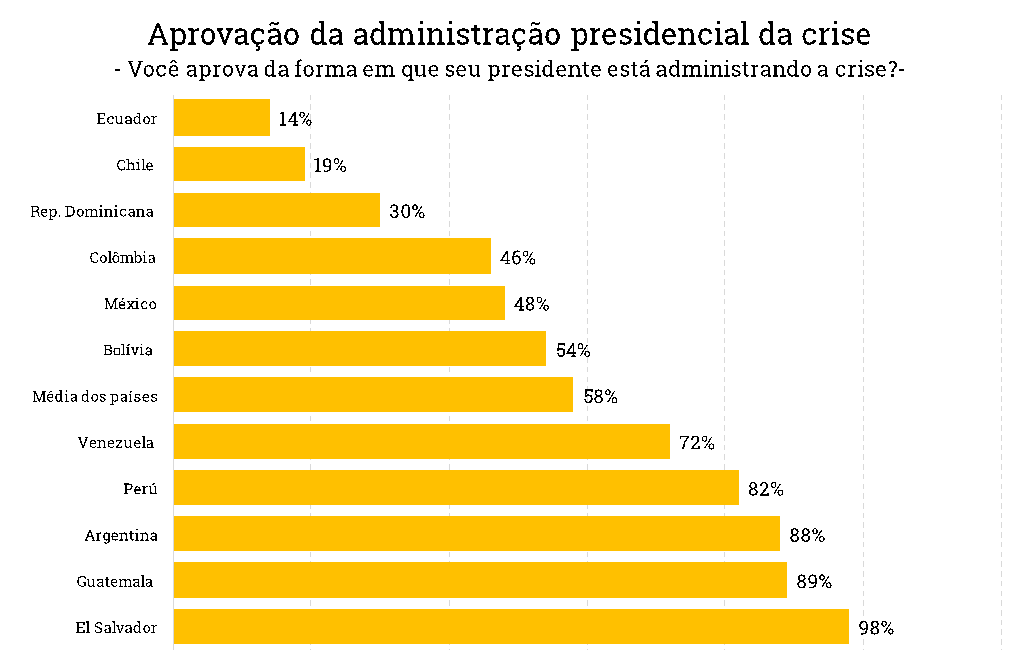 Como panorama global na imagem dos presidentes da região, vale observar a pesquisa Mitofsky, realizada entre os dias 22 e 25 de março em vários países da América Latina, que nos permite fazer uma avaliação de como o coronavírus afeta a aprovação presidencial.