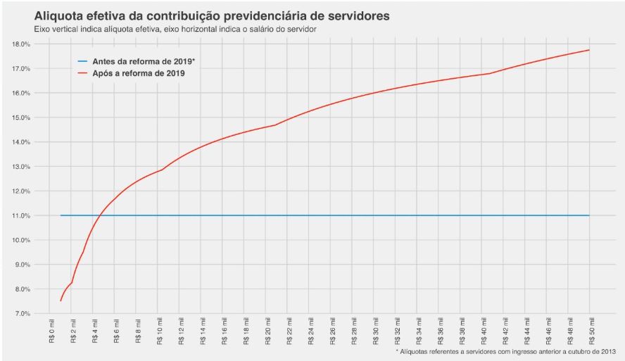 Antes da reforma, a contribuição dos servidores era equivalente a 11% do salário integral, no caso de quem entrou no serviço público antes de 2013, ou 11% do teto do INSS, no caso de quem entrou depois. Após a reforma, cada faixa de salário paga uma alíquota diferente, que começa em 7,5% e chega a 22% na faixa de salário que exceder R$ 40797,20.