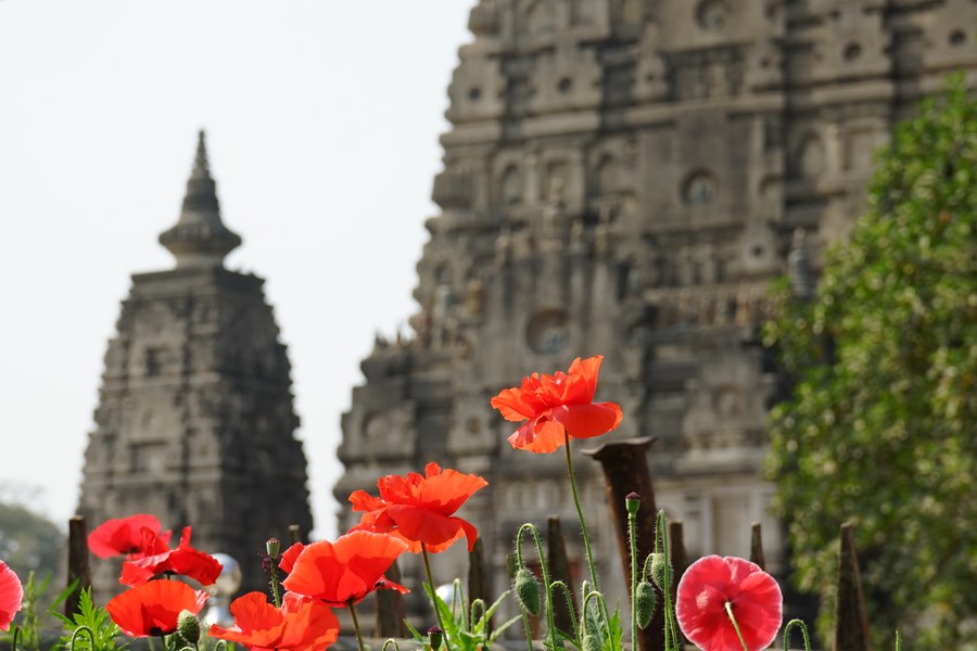 Papoulas selvagens em frente ao Templo Mahabodhi