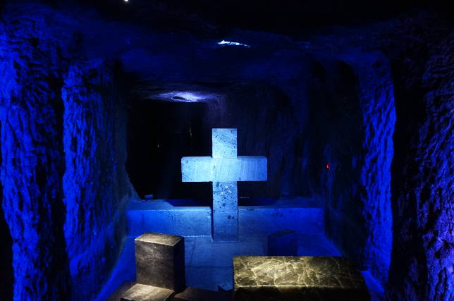 A ideia é essa mesmo. Trata-se de uma reprodução da Via Sacra. Enquanto desço, vejo capelas esculpidas em pleno sal que mudam de cor e desembocam em grandes túneis que se espalham em todas as direções. É a Via Crucis na Colômbia!