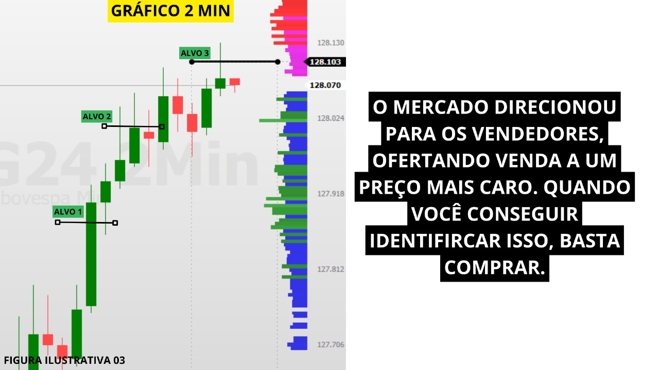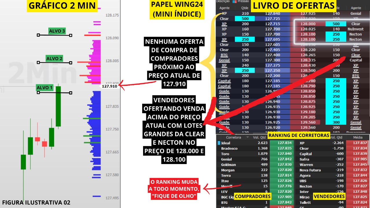 Agora no exemplo 3 você já consegue observar que os alvos de 128.000 e 128.100 dos respectivos vendedores Clear e Necton foram consumidos. Agora basta esperar uma nova oportunidade se confirmar em sua tela operacional.