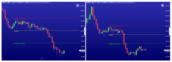 Para vermos a diferença no risco nas ocasiões em que a volatilidade aumenta, separei dois exemplos parecidos de movimentação: correção para novas quedas, considerando que a venda seja feita na mínima com stop acima da máxima: