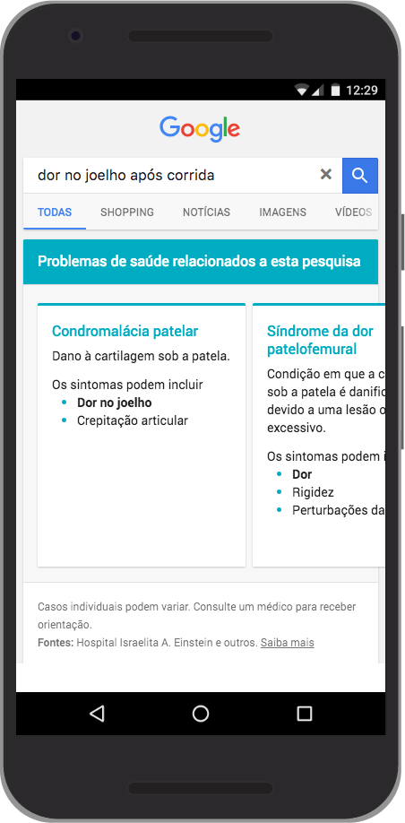 De acordo com os dados do Google, a pesquisa sobre saúde representa uma a cada 20 na plataforma no mundo. “ A partir de hoje, ao pesquisar por dor no joelho depois da corrida, por exemplo, um painel informativo de doenças relacionadas, tratamentos, entre outros, será apresentado no resultado; todos revisados por médicos do Albert Einstein, de São Paulo”, diz o comunicado da assessoria do hospital.
