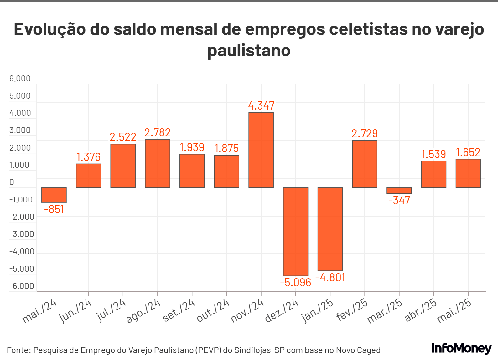 O varejo paulistano voltou a mostrar reação no mercado de trabalho. Dados da Pesquisa de Emprego do Varejo Paulistano (PEVP), elaborada pelo Sindilojas-SP, mostra que foram criadas 1.652 vagas com carteira assinada em maio, resultado que representa o melhor desempenho para o mês desde 2022 — e o segundo mês consecutivo de crescimento.