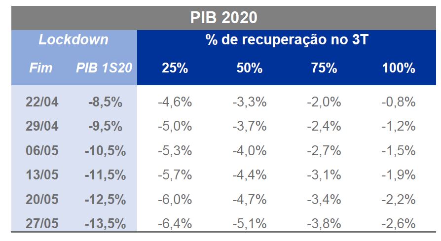 Em um quadro, o banco destaca os cenários para o PIB deste ano tendo como base as diferentes hipóteses de isolamento e de ritmo de recuperação. O cenário mais pessimista da instituição é de isolamento até 27 de maio, o que levaria a uma queda de 13,5% no PIB do primeiro semestre, e 25% de recuperação no terceiro trimestre. Com isso, o PIB fechado de 2020 seria de uma queda de 6,4%.