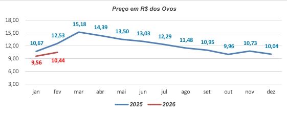 No acumulado do primeiro bimestre, a variação foi de 3,98%, com o preço médio saindo de R$ 10,04 em dezembro de 2025 para R$ 10,44 em fevereiro de 2026, sinalizando uma tendência de alta já em curso desde o fim do ano passado.