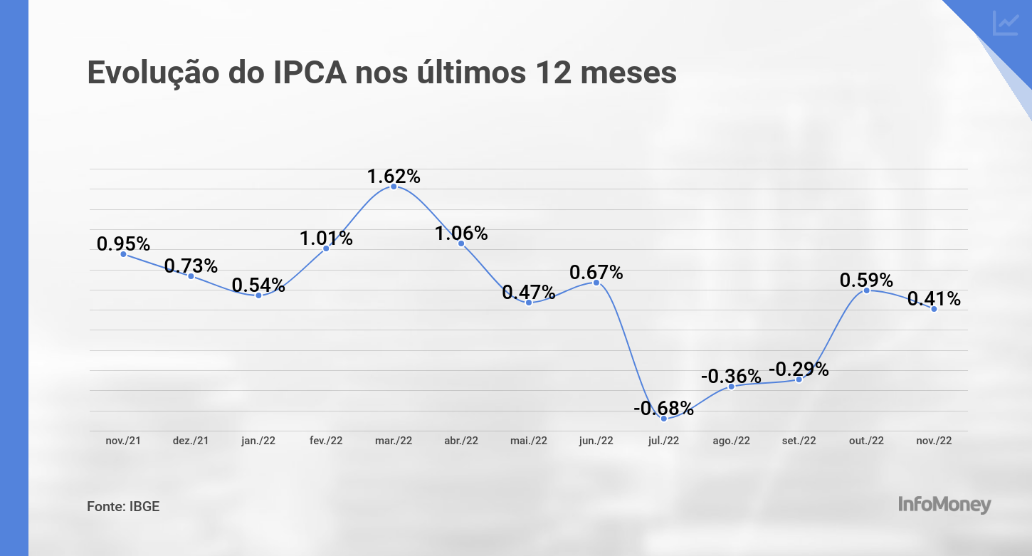 O Índice Nacional de Preços ao Consumidor Amplo (IPCA) subiu 0,41% em novembro na comparação com outubro, informou nesta sexta-feira (9) o Instituto Brasileiro de Geografia e Estatística (IBGE). Com isso, a inflação acumulada em 12 meses foi a 5,90%. No ano, a inflação está em 5,13%.