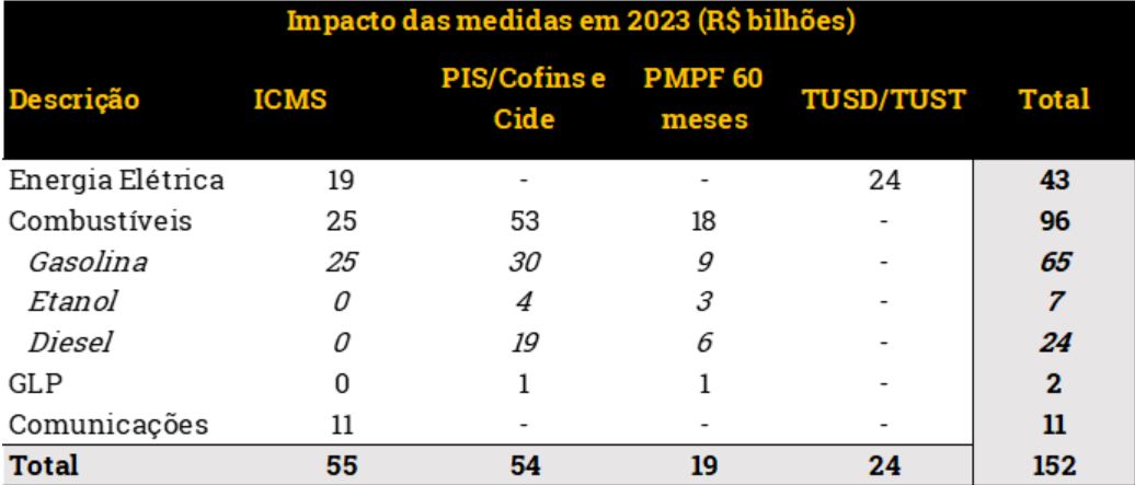 Os economistas da XP estimam um impacto de até R$ 152 bilhões em 2023 com as mudanças recentes da legislação e das decisões judiciais. Considerando um crescimento das vendas de combustíveis de 5% e das receitas de energia elétrica em 10% em 2023, avaliam um impacto de R$ 54 bilhões decorrente da manutenção da desoneração de PIS/Cofins e Cide sobre combustíveis.