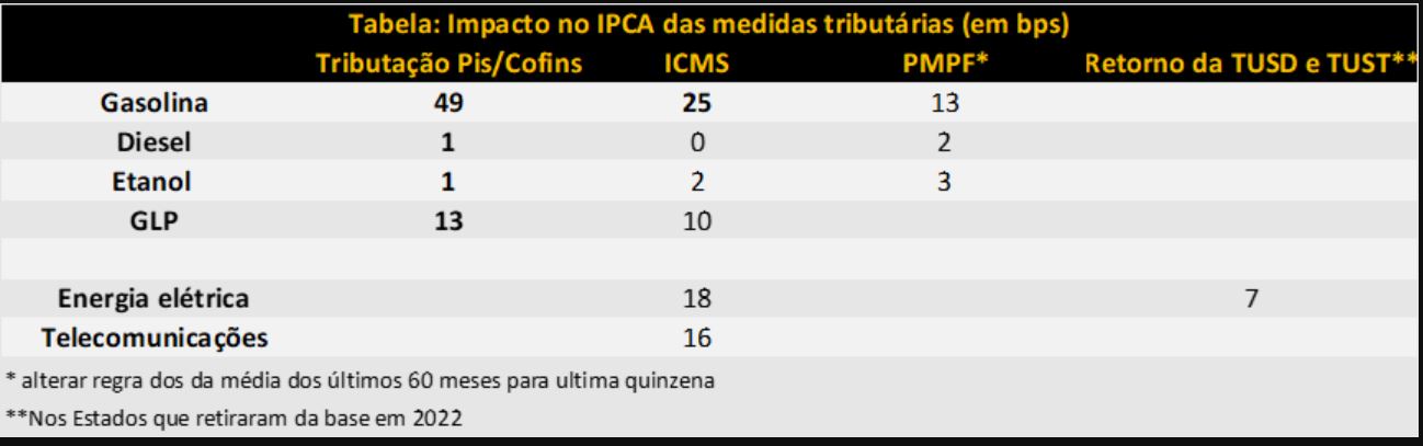 Já a alteração da regra de PMPF tratada na Lei complementar nº 192/2022, com substituição pelo preço médio dos últimos 15 dias, chegaria a impacto de até 18 pontos-base no IPCA, sendo 13 pontos só devido à gasolina.