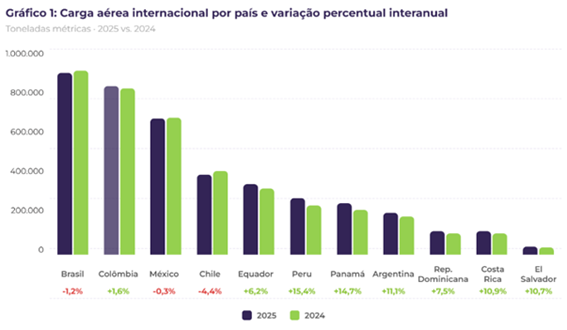 A Colômbia, segundo maior mercado regional de carga aérea, teve crescimento modesto, de +1,6%), enquanto o México mostrou queda de -0,3% em 2025. Embora México–Estados Unidos tenha sido o principal corredor de carga aérea internacional do país, o tráfego com China apresentou crescimento relevante em 2025, com aumento interanual de 14,6%, explicado principalmente pelo aumento das importações provenientes da China.