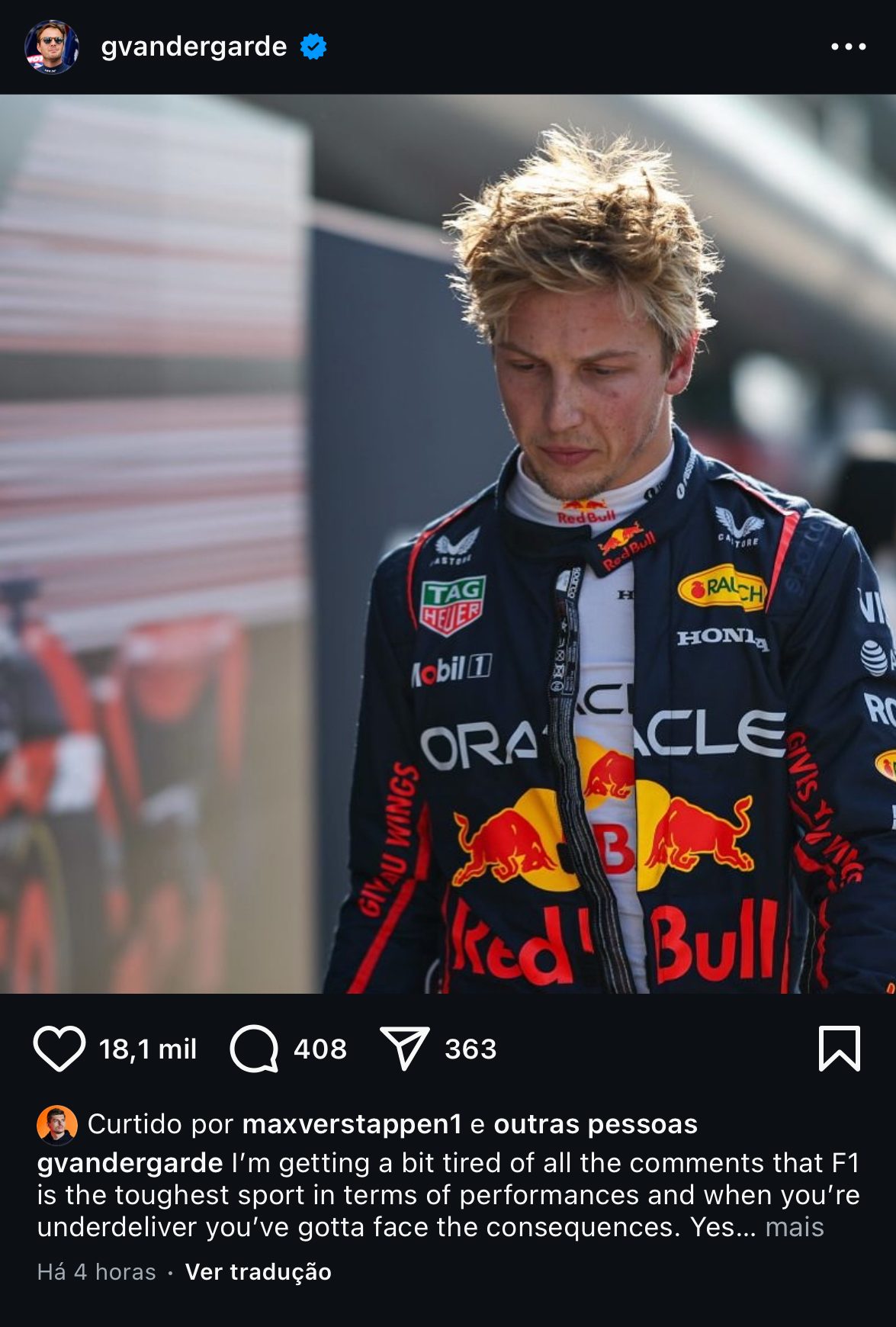 Atual tetracampeão do mundo e principal nome da Red Bull, o holandês Max Verstappen curtiu uma postagem nas redes sociais do ex-piloto de Fórmula 1 Giedo van der Garde, onde ele critica a equipe austríaca por ter tirado Liam Lawson de cena com apenas duas corridas disputadas para colocar Yuki Tsunoda.