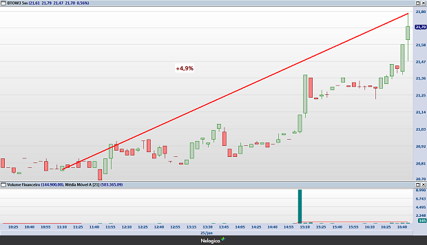 Outros casos, no entanto, já não tem motivos tão claros, como a impressionante disparada das ações da B2W (BTOW3), que desde às 11h20 (horário de Brasília), quando começou a circular a notícia sobre o recurso e o mercado passou a regiar, as ações da varejista online dispararam quase 5%, como pode-se observar no gráfico abaixo.