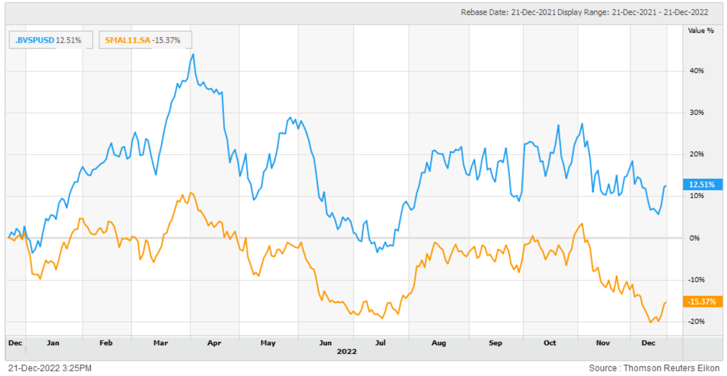 Segundo ele, um dos principais motivos que justificam essa diferença entre Ibovespa e o índice de small caps, e também para com as companhias estreantes, é que em 2022 a Bolsa brasileira recebeu um considerável fluxo de capital estrangeiro. “Tivemos, principalmente, capital estrangeiro entrando ao longo do ano na Bolsa brasileira. E os gringos costumam entrar em ações mais líquidas, nas blue chips, com as small caps ficando em segundo plano”, contextualiza.