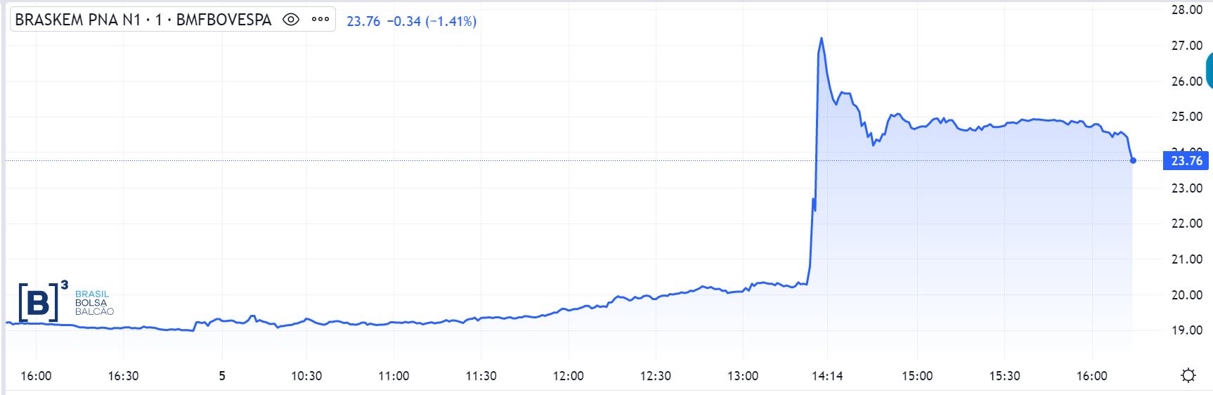 Os investidores de ações da Braskem (BRKM5) tiveram uma tarde de fortes emoções nesta sexta-feira (5). No início da tarde, em um movimento brusco, os papéis passaram a ter uma sessão de disparada, com ganhos que chegaram a ser de 41,52%, a R$ 27,20.