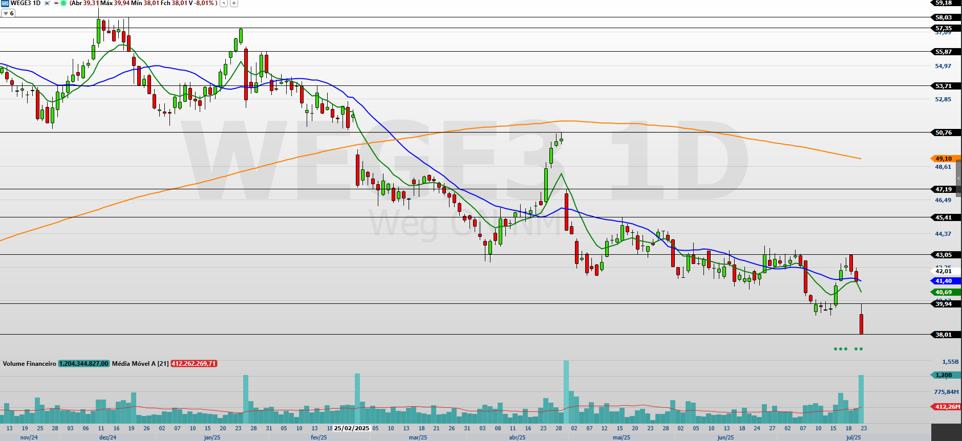 No gráfico diário, observo uma tendência clara de baixa, reforçada pela movimentação recente. Na última sessão, WEGE3 caiu 8,01%, fechando cotada a R$ 38,01. O ativo rompeu mínimas anteriores e segue negociando abaixo das médias de 9 e 21 períodos, ambas com inclinação negativa.