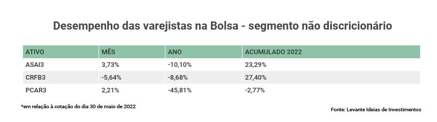 Em abril, o valor da cesta básica aumentou em todas as capitais brasileiras mapeadas pelo Dieese. No acumulado de 12 meses, as variações oscilaram entre 17,07% e 29,93%, ou seja, bem acima da variação do IPCA (que atingiu 12,3% naquele mês). A busca por descontos passou a fazer parte da rotina do brasileiro e ajudou a fortalecer o modelo cash and carry, de vendas no atacado, no qual o consumidor adquire uma maior volume de mercadorias com preços unitários mais baixos. Também acabou jogando a favor de Carrefour Brasil (CRFB3), dona da rede Atacadão, e Assaí (ASAI3) no que diz respeito ao desempenho de suas ações.