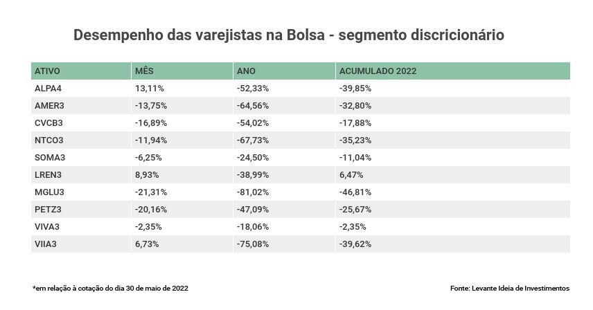 No segmento de varejo discricionário, de bens “não essenciais”, os papéis de Magazine Luiza (MGLU3), Alpargatas (ALPA4) e Via (VIIA3) tiveram os maiores tombos em 2022 (levando em conta o preço de fechamento das ações em 30 de maio). Já Grupo Soma (SOMA3), Vivara (VIVA3) e, em alguma medida, Lojas Renner (LREN3), que miram em um público de renda mais alta, não sofreram na mesma proporção.