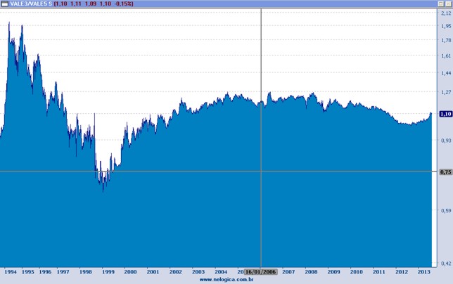 O gráfico abaixo mostra a relação de preços entre as ações ordinárias e preferenciais da Vale. Quando o “ratio” está acima de 1,0, significa que VALE3 estava valendo mais que VALE5; com ratio abaixo de 1,0, VALE3 estava mais barata que VALE5.