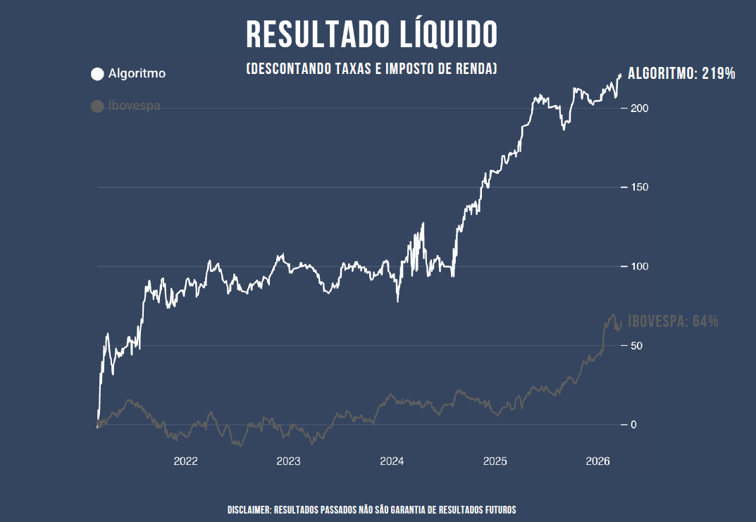 Quando analisado em relação a benchmarks tradicionais, o desempenho do algoritmo apresenta um diferencial relevante. A estratégia entrega retorno consistente mesmo após considerar custos operacionais, como corretagem e impostos, o que oferece uma visão mais realista ao investidor.