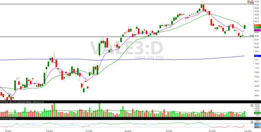 Segundo os analistas técnicos do Itaú Fábio Perina, Lucas Piza e Igor Caixeta, existia a possibilidade de um repique em VALE3, após a consolidação do suporte em 84,50.