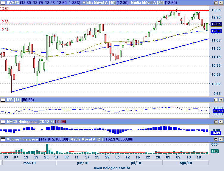 Assim como no caso da Petrobras, as ações ordinárias da BM&F Bovespa (BVMF3) foram sugeridas pela equipe da Focques ante o teste da média móvel de 40 dias (R$ 12,26) e o nível sobrevendido do IFR intradiário.