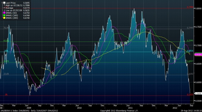 Conforme explica o analista técnico da corretora do Votorantim, a divisão entre a cotação das ações PNA da Vale e do ETF do Ibovespa está em 0,57, muito abaixo da relação vista entre agosto e novembro de 2011, de 0,80. A expectativa de Espinoso é que os papéis da mineradora se recuperem no curto prazo, tendo em vista que acabaram de tocar em um forte suporte: sua mínima dos últimos cinco anos.