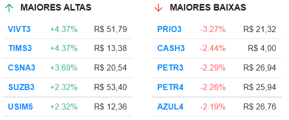 11h01 – Vivo (VIVT4 e Tim (TIMS3) são maiores altas do Ibovespa após STF reduzir ICMS para empresas de telecom
