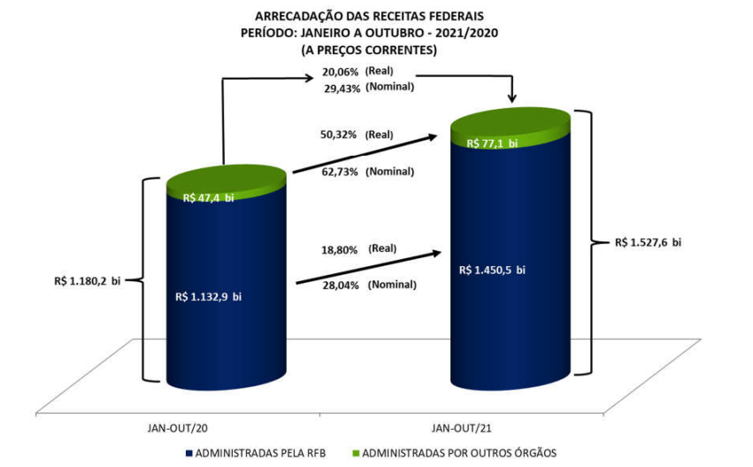 Segundo a Receita Federal, no acumulado de janeiro a outubro de 2021 a arrecadação alcançou o valor de R$ 1,527 trilhão, representando um acréscimo pelo IPCA de 20,06%.