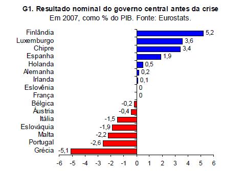 E mesmo com o câmbio desvalorizado, essas economias (cujo caso alegórico é a Grécia) não se beneficiam tanto, uma vez que seu comércio externo se concentra no mercado interno europeu, além de se basear muito no turismo, setor muito prejudicado pela crise. Outro ponto crucial é que são países que já tinham histórico de displicência fiscal, como mostra o gráfico abaixo, e na visão dos consultores, com tudo isso combinado, as economias “parecem condenadas a um período prolongado de desempenho anêmico”