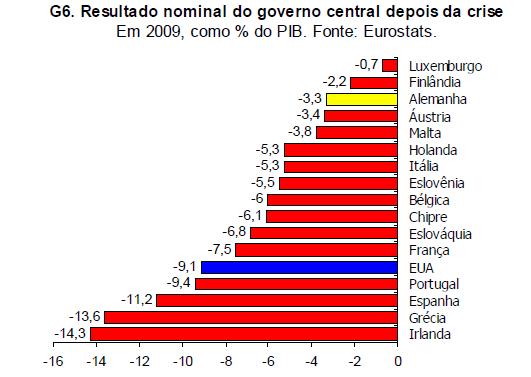 A equipe LCA lembra ainda que apesar dos déficits, as contas públicas não parecem em “rota de deterioração progressiva”. Como exemplo, é citado o déficit da Alemanha, baixo se comparado ao dos EUA e dos demais países europeus, de modo que o governo estaria longe de um quadro de insolvência.
