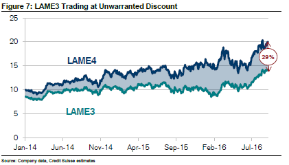 Isso deixou o múltiplo do papel elevado, comentam. Atualmente, a ação LAME4 é negociada a 48 vezes o LPA (Lucro Por Ação) projetado para 2017, o que justificou um potencial de valorização projetado pelo Credit ainda limitado para a ação. O preço-alvo do papel foi elevado de R$ 15,83 para R$ 22,00, o que indica um upside de 10% frente ao fechamento anterior. Ainda assim, eles ressaltam que o prêmio bastante elevado em relação aos pares não é motivo para os investidores se afastarem da ação. Eles fazem uma comparação com Raia Drogasil (RADL3), que negocia a 35 vezes o LPA, mas ainda se mostra bem atrativa na Bolsa, com uma execução “impecável” e projeção de crescimento de 400% no período de 2013 a 2016.